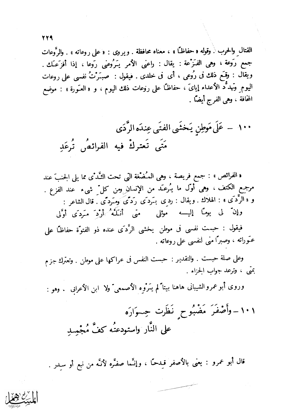 (علَى مَوطنٍ يَخشَى الفتى عِندَه الرَّدَى ... مَتَى تَعترِكْ فيه الفرائصً تُرعَدِ)