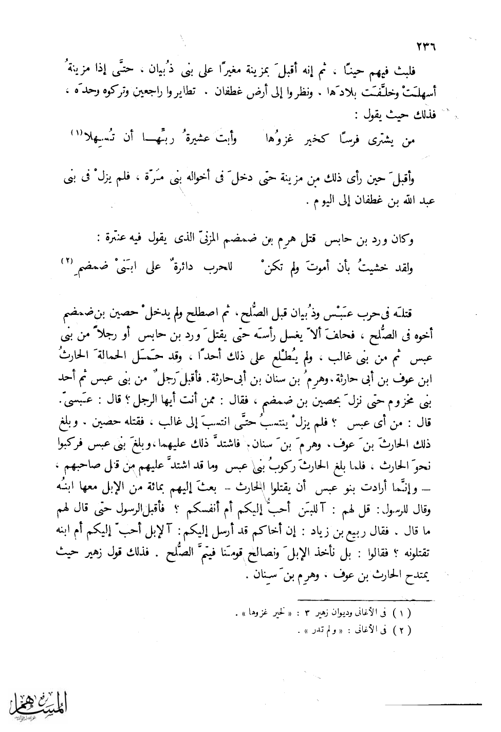 الإبل أحب إليكم أم ابنه تقتلونه؟ فقالوا: بل نأخذ الإبل ونصالح قومنا فيتم الصلح، فذلك قول زهير