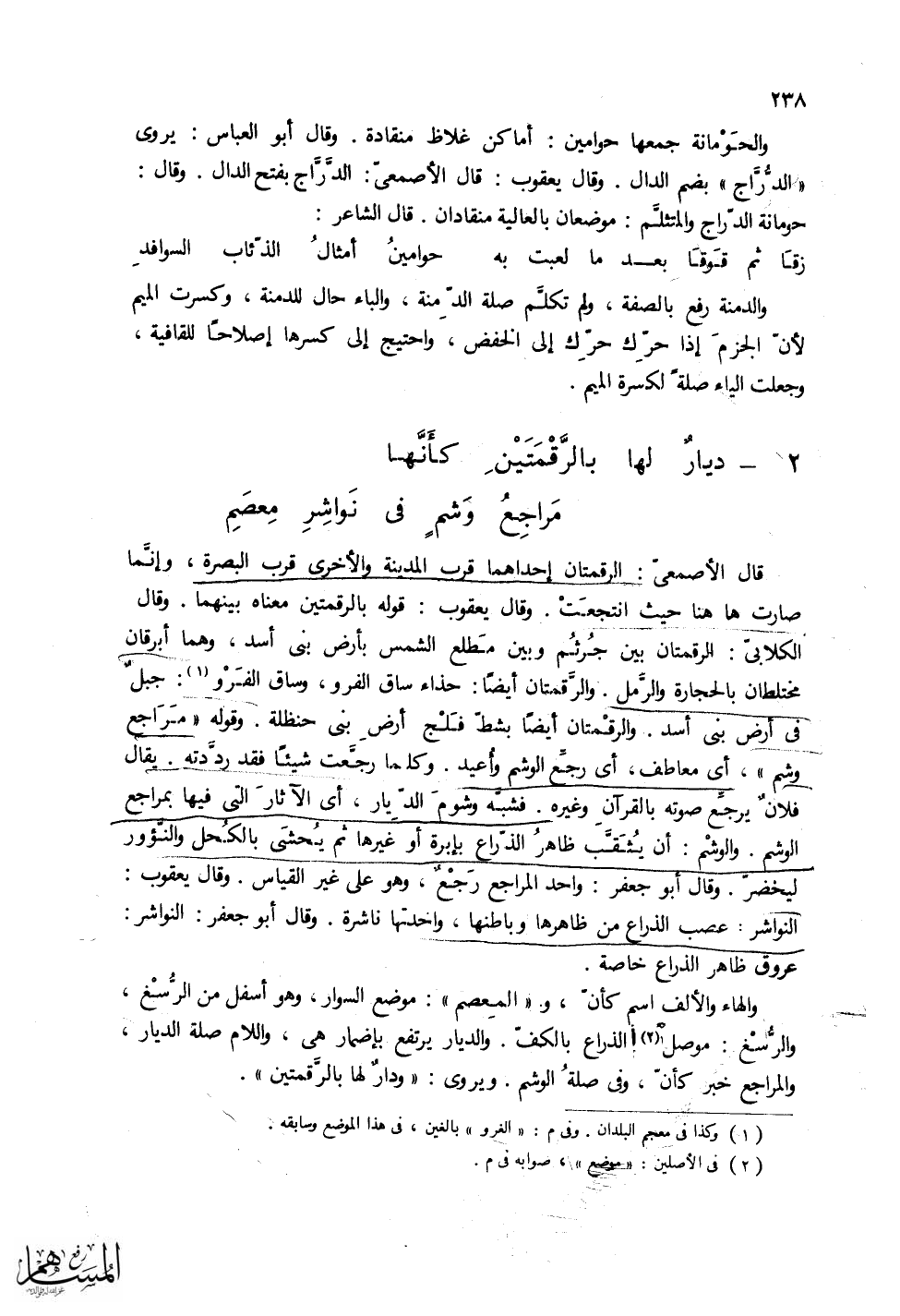 (دِيارٌ لها بالرَّقْمَتَيْن كأَنَّها ... مَراجعُ وَشْمٍ في نَواشِرِ مِعصَمِ)