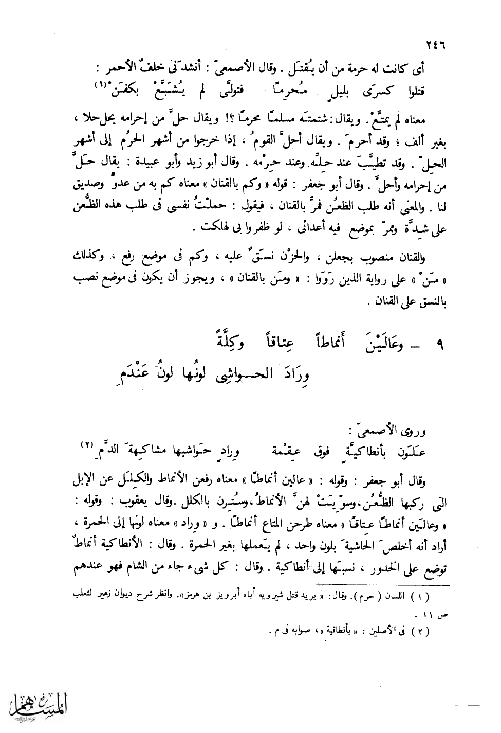 (وعالَيْنَ أَنماطاً عِتاقاً وكِلّةً ... وِرَادَ الحواشي لونها لونُ عَنْدمِ)