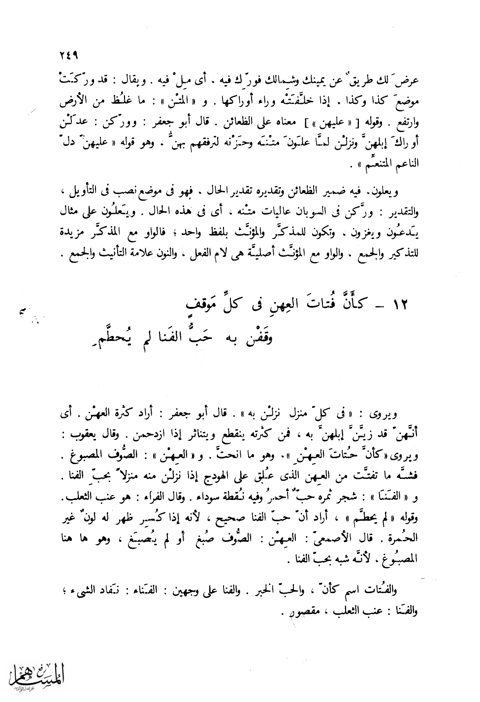 ويروى: (في كل منزل نزلن به). قال أبو جعفر: أراد كثرة العهن. أي أنهن قد زين إبلهن به، فمن