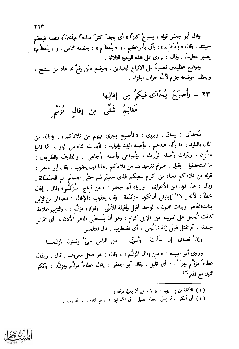 وروى أبو عبيدة: (من إفال المزنم)، وقال: هو فحل معروف. قال: ويقال عطاء مزنم ومزند، أي