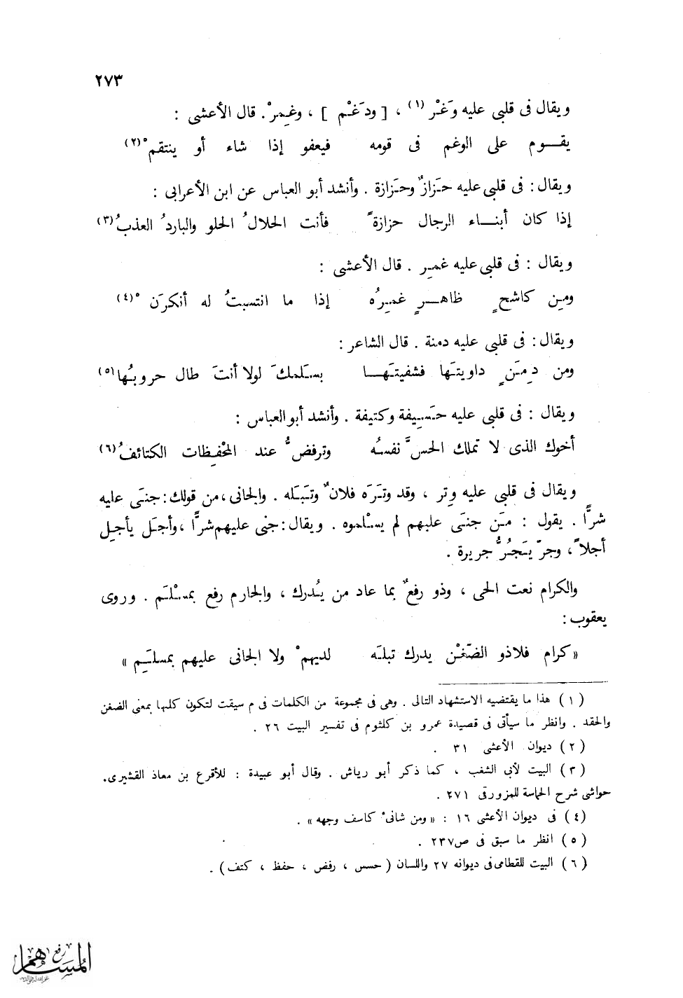 ويقال: في قلبي عليه غمر. قال الأعشى: