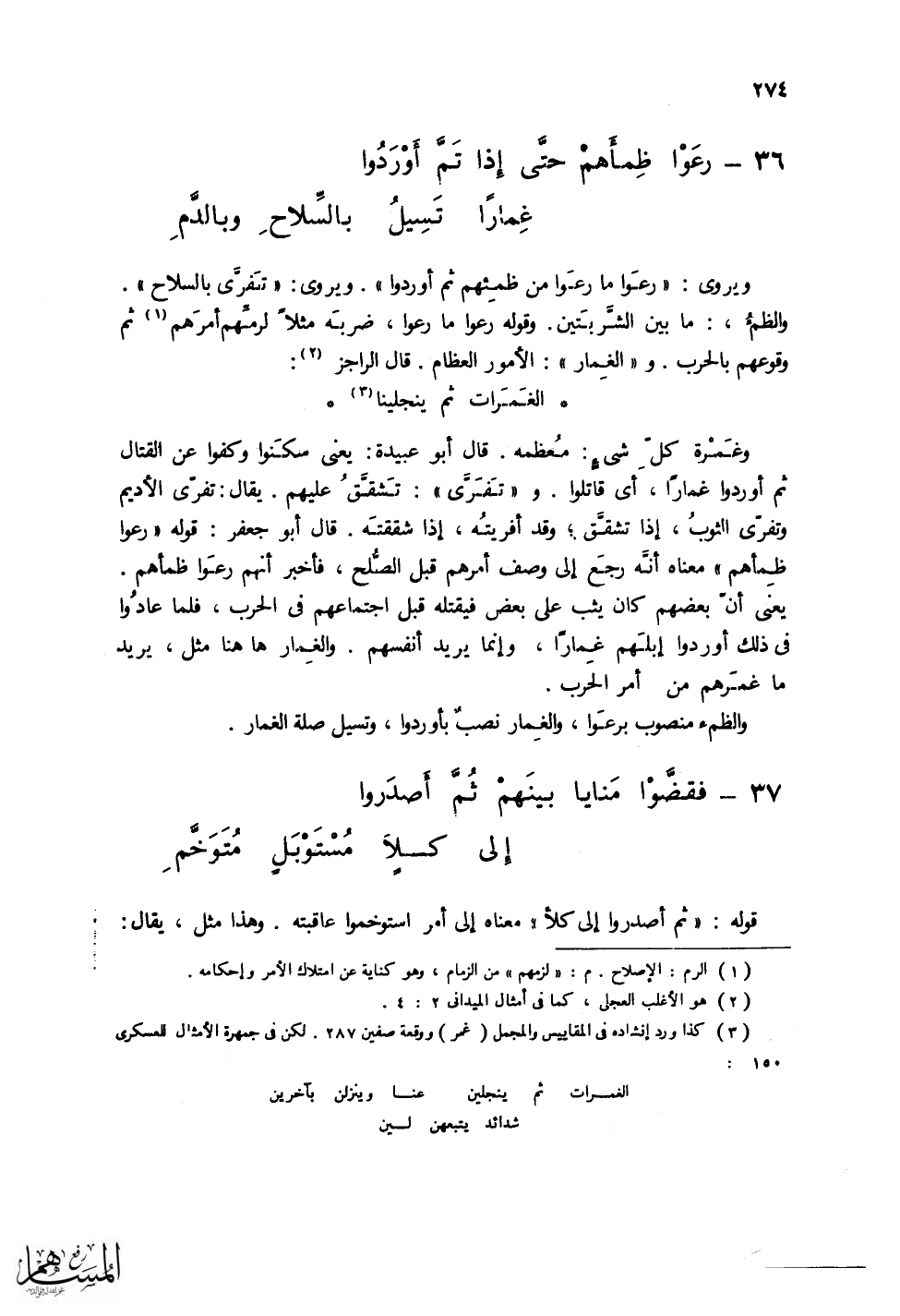 (رَعْوا ظِمْأَهم حتَّى إذا تَمَّ أَوْرَدَوا ... غِماراً تَسِيلُ بالسِّلاح وبالدَّمِ)