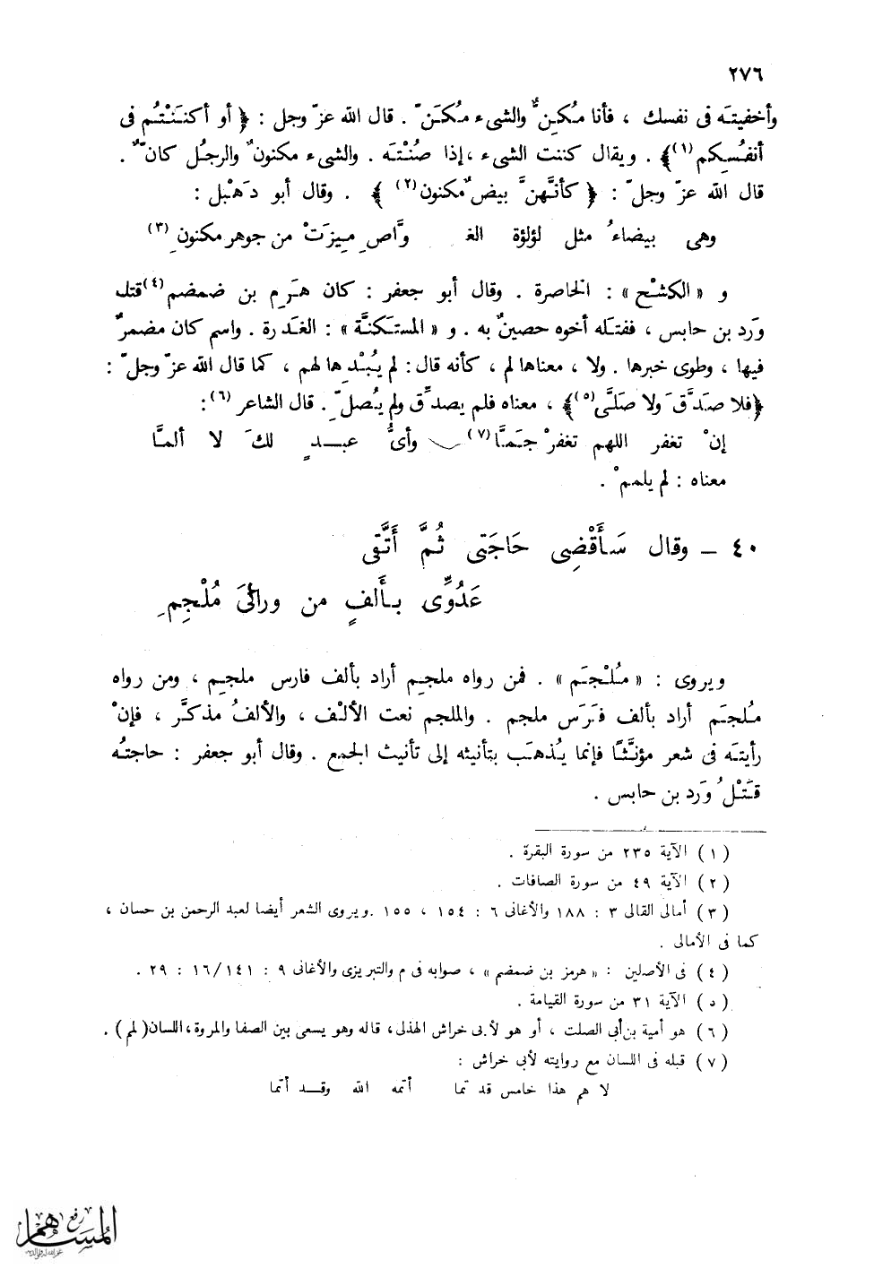 (وَقالَ سَأَقْضي حَاجَتي ثُمَّ أَتَّقي ... عَدُوِّي بأَلْفِ منْ ورَائيَ مُلجِمِ)