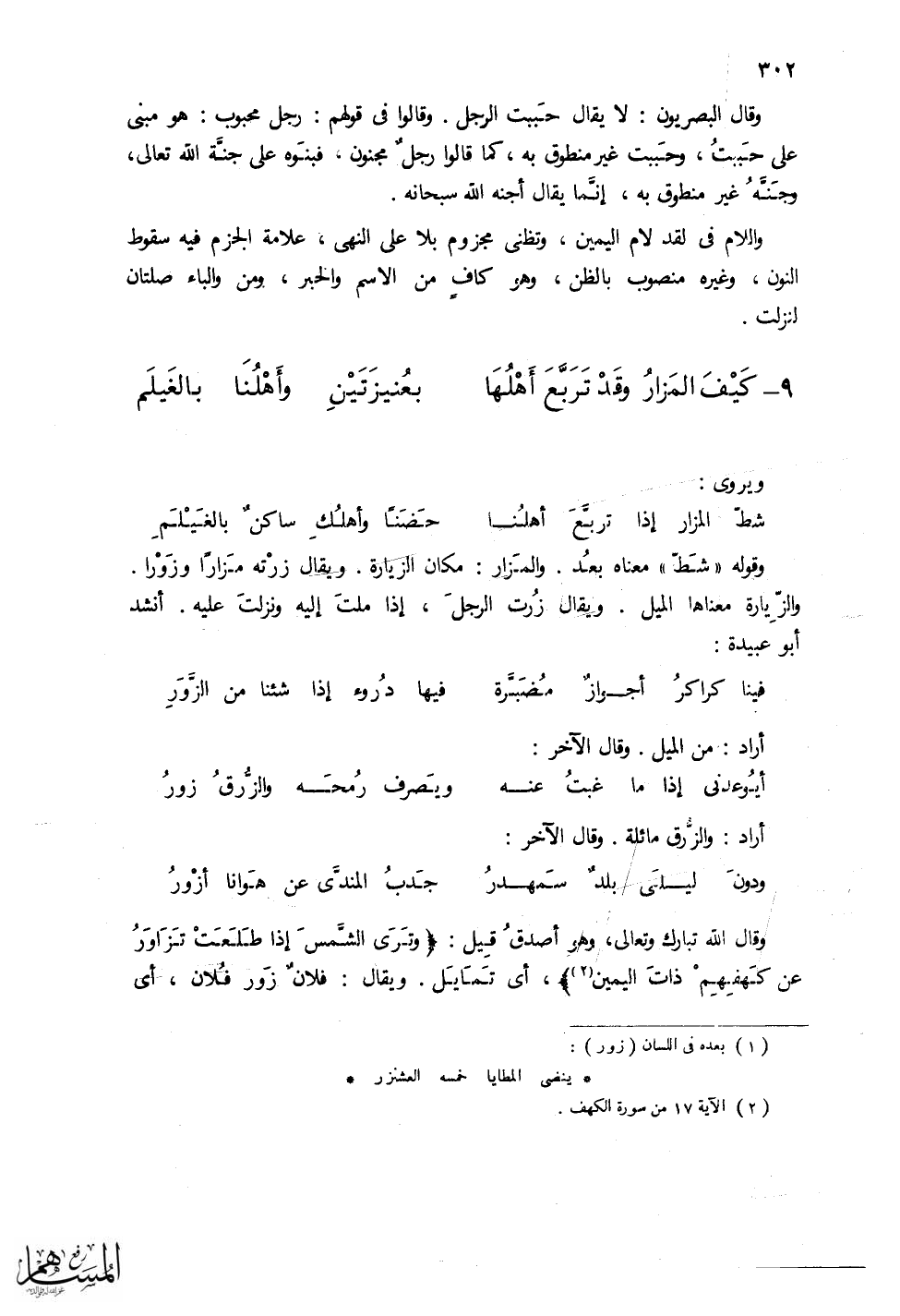ويقال زرت الرجل، إذا ملت إليه ونزلت عليه. أنشد أبو عبيدة: