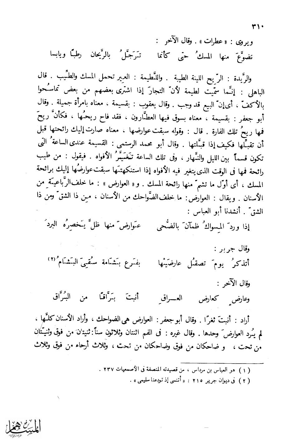تضوَّعَ منها المسكُ حتى كأنما ... تَرَجَّلُ بالرَّيحان رطباً ويابسا