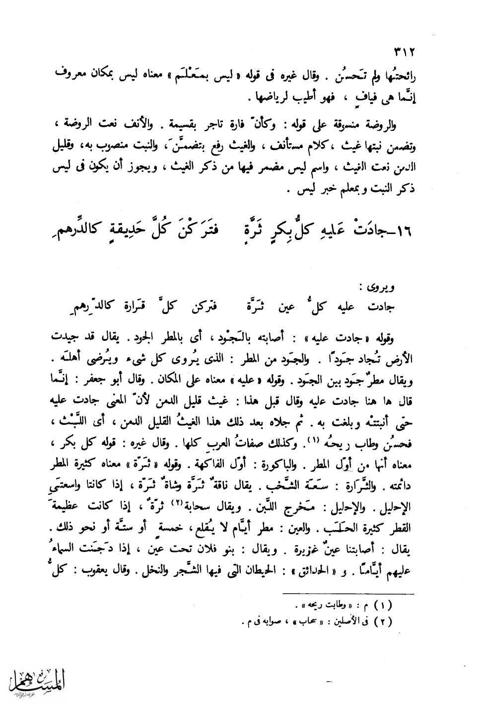 (جادَتْ عَليهِ كلُّ بِكرٍ ثَرَّةٍ ... فتَرَكْنَ كُلَّ حَدِيقةٍ كالدِّرهمِ)