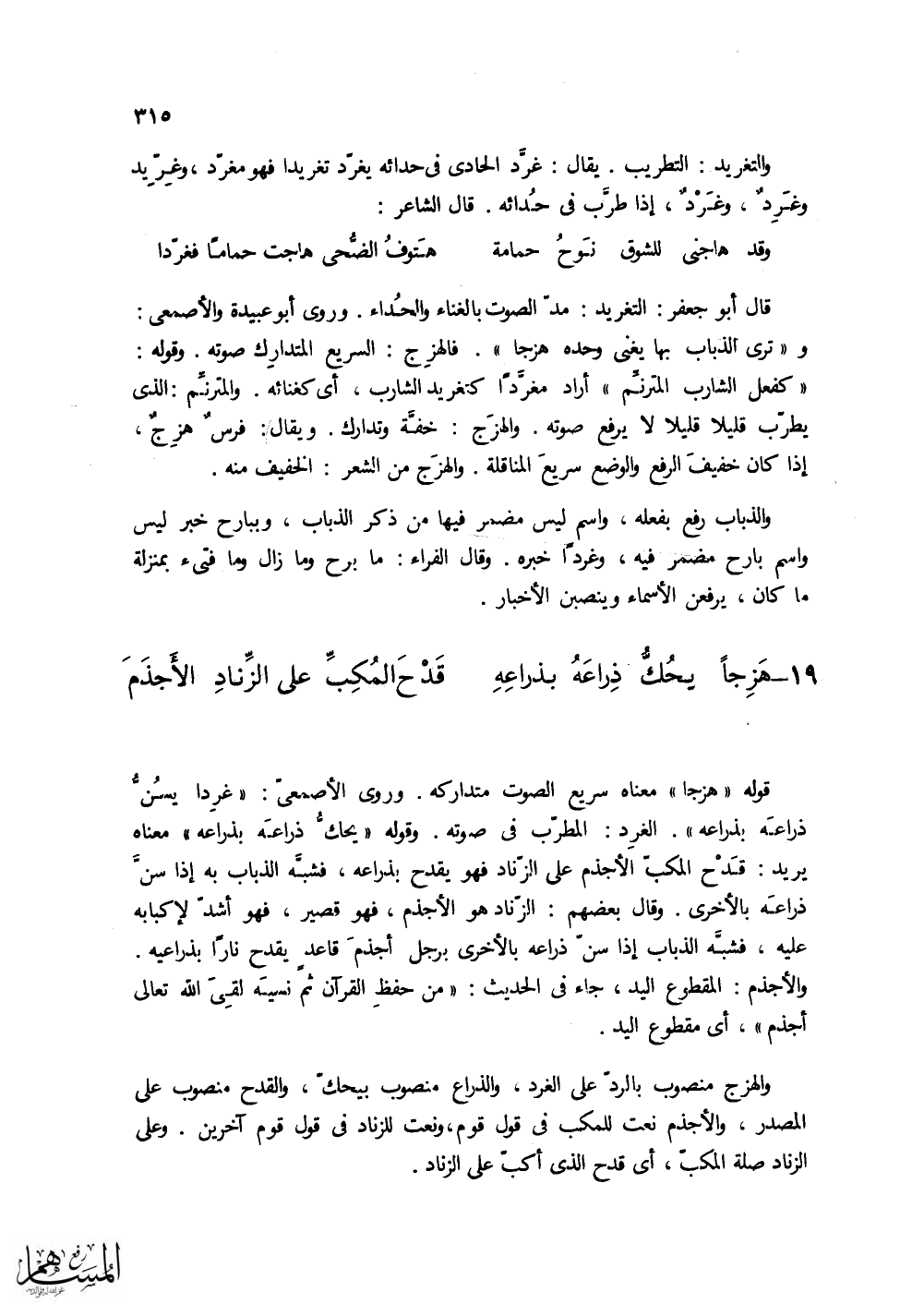 والهزج منصوب بالرد على الغرد، والذراع منصوب بيحك، والقدح منصوب على المصدر،