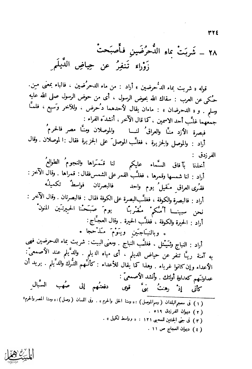 (شَرِبتْ بماءِ الدُّحرُضَينِ فأَصبَحتْ ... زَوْراءَ تَنفِرُ عن حِياضِ الدَّيلَمِ)