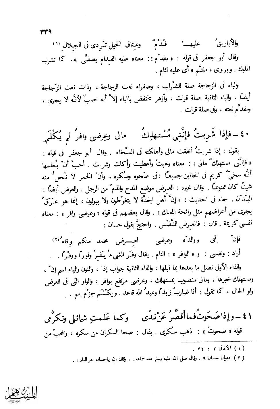 (فإِذا شَرِبْتُ فإِنَّنِي مُسْتهلِكٌ ... مالِي وعِرضي وافرٌ لم يُكْلَمِ)