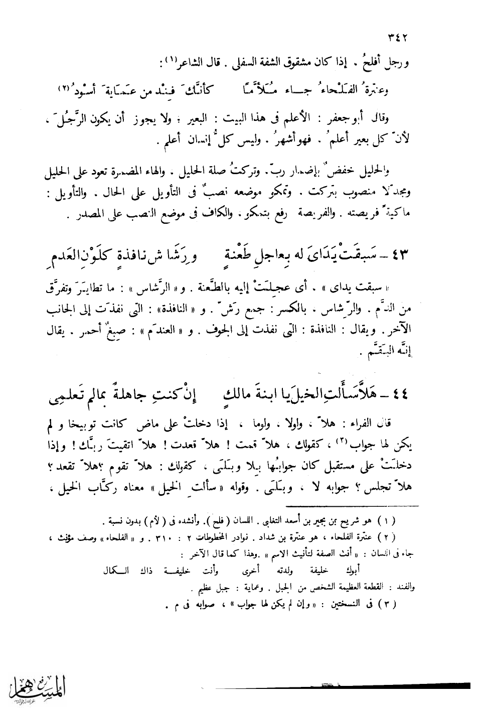 (هَلاَّ سَأَلتِ الخيلَ يا ابنةَ مالكٍ ... إِنْ كنتِ جاهلةٍ بما لم تَعلَمِي)