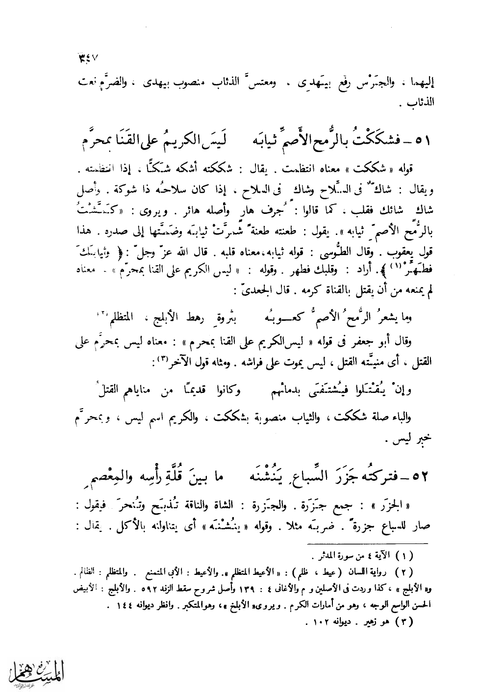 وقال أبو جعفر في قوله (ليس الكريم على القنا بمحرم): معناه ليس بمحرم على القتل، أي منيته