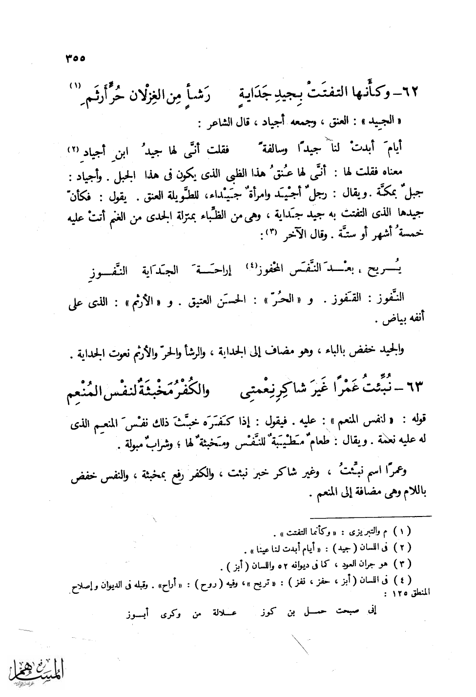 (وكأَنَّها التفتَتْ بِجيدِ جَدَايةٍ ... رَشأٍَ مِن الغِزلان حُرٍّ أَرثَمِ)