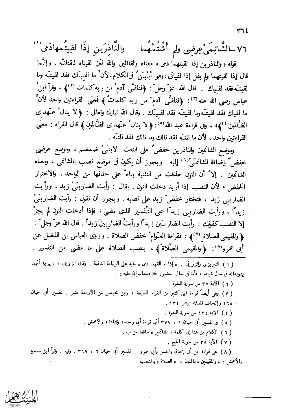 النصب كقولك: رأيت الضاربين زيداً ورأيتُ الضاربِين زيدا. قال الله عز وجل: (والمقيمي الصلاةِ)،