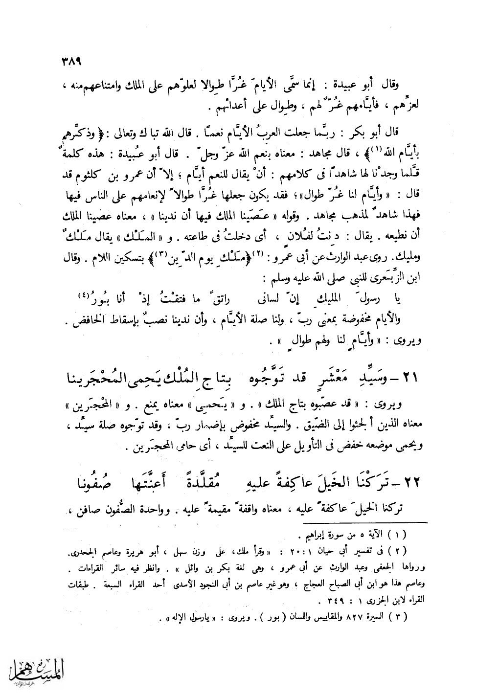 قال أبو بكر: ربما جعلت العرب الأيام نعما. قال الله تبارك وتعالى: (وذكِّرهم بأيَّام الله)، قال مجاهد: