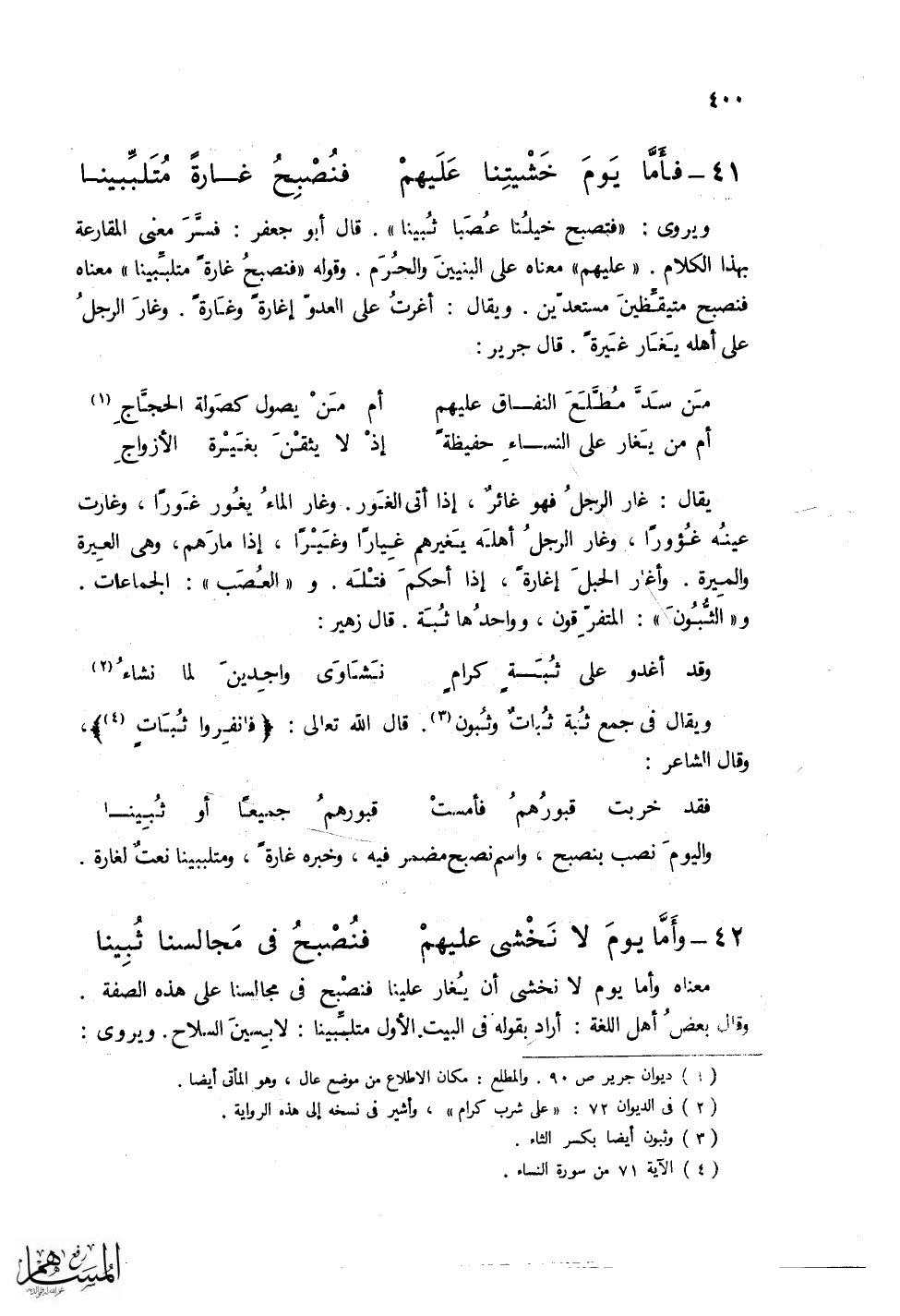(فأَمَّا يَومَ خَشْيتِنا عَلَيهمْ ... فنصْبِحُ غارةً مُتلبِّبينا)