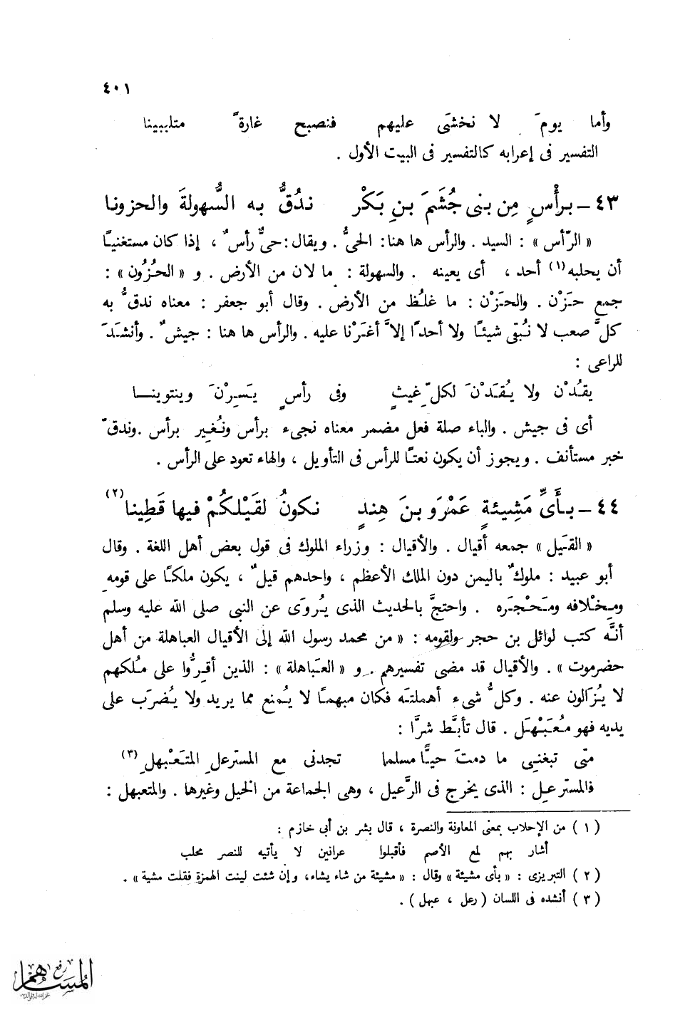 (برأْسٍ مِن بني جُشَمَ بنِ بَكْرٍ ... ندُقُّ به السُّهولةَ والحُزونا)