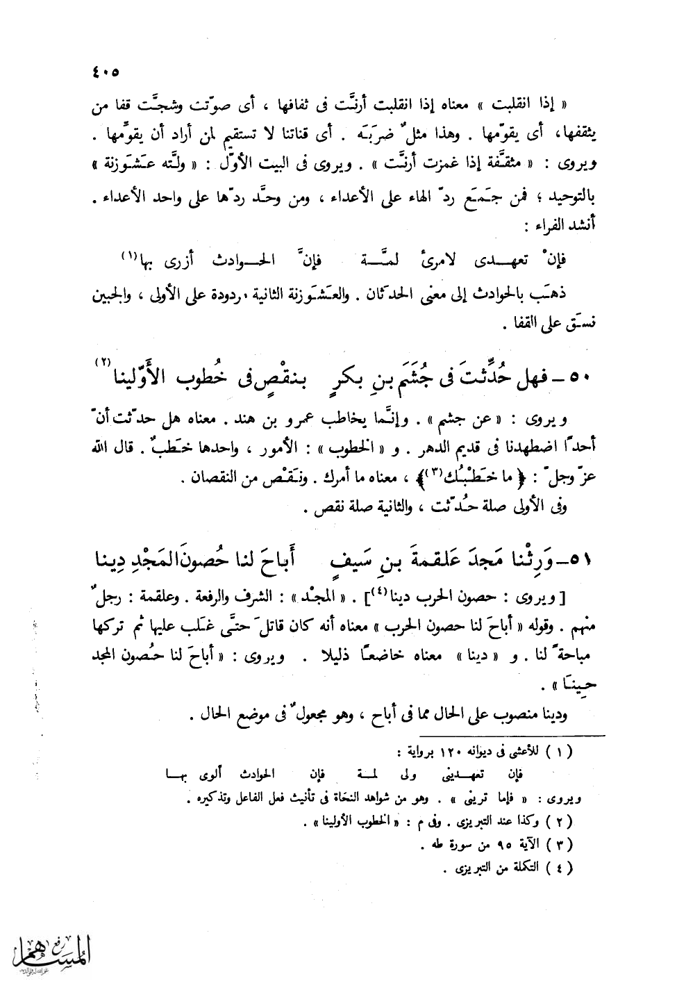 (وَرِثْنا مَجدَ عَلْقمةَ بنِ سَيفٍ ... أَباحَ لنا حُصون المَجْدِ دِينا)