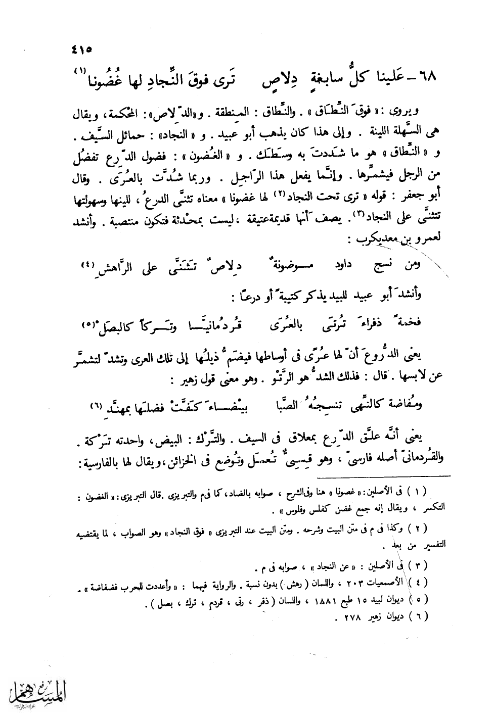 ويروى: (فوق النطاق). والنطاق: المنطقة. و (الدلاص): المحكمة، ويقال هي السهلة اللينة. وإلى