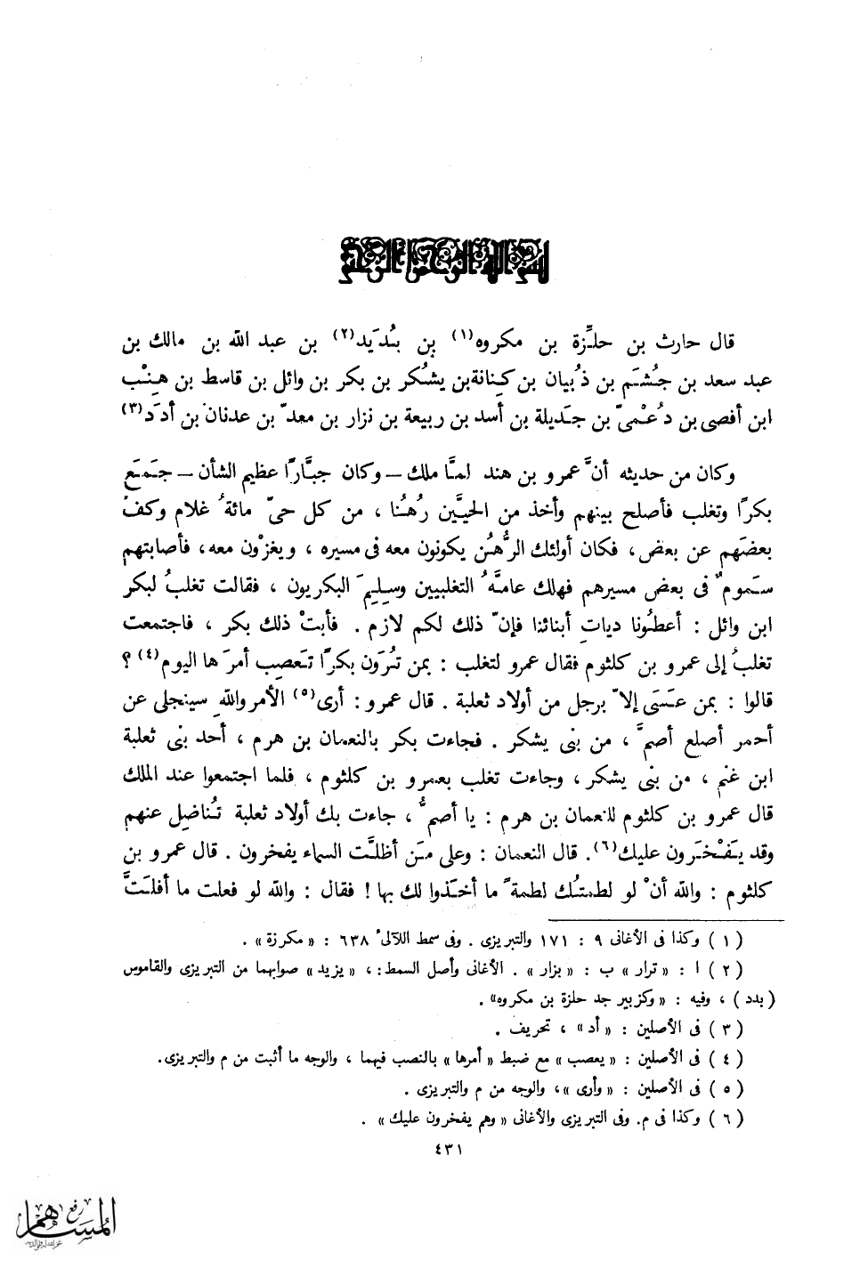 فاجتمعت تغلب إلى عمرو بن كلثوم فقال عمرو لتغلب: بمن ترون بكرا تعصب أمرها اليوم؟ قالوا: