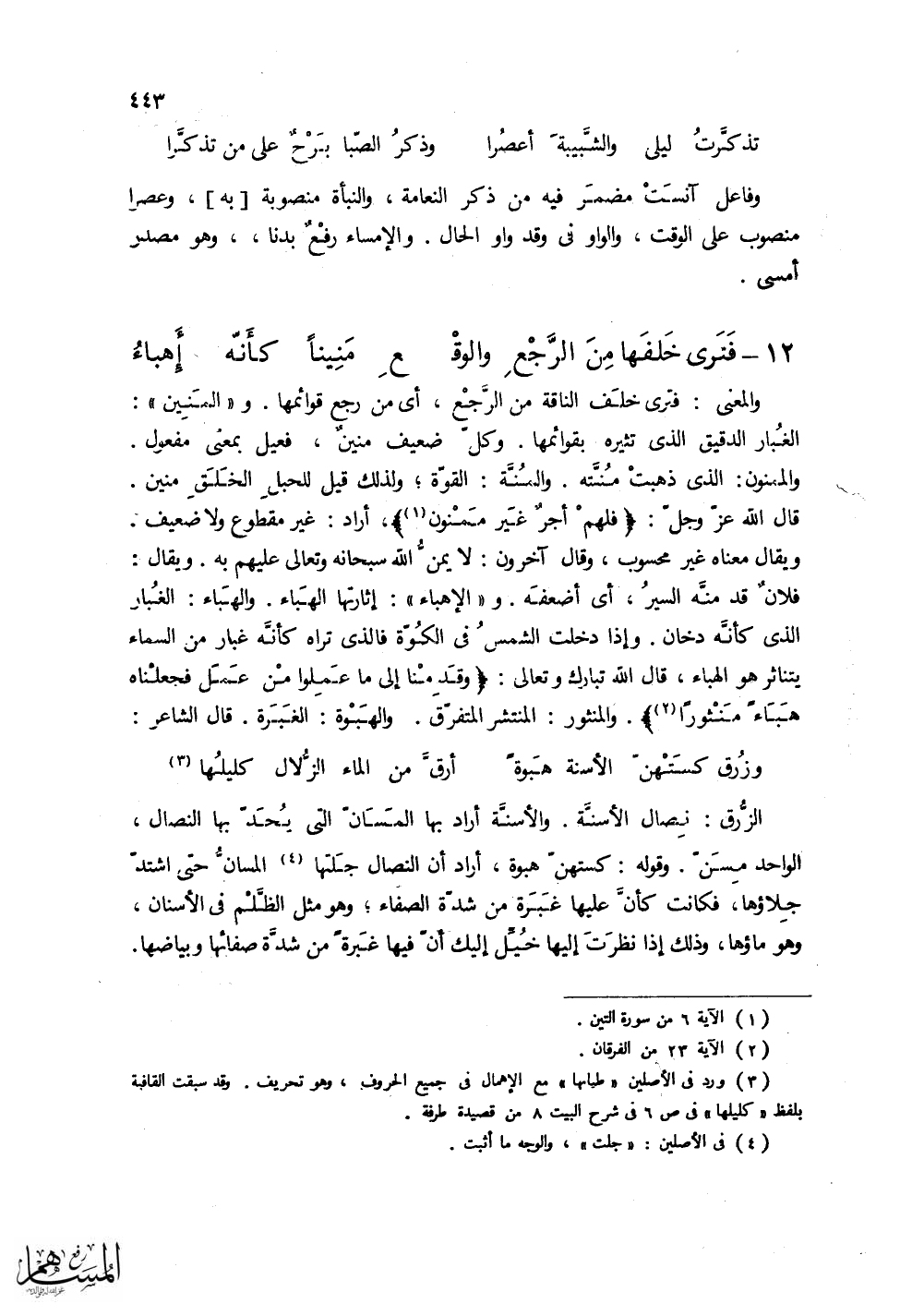 والمعنى: فترى خلف الناقة من الرجع، أي من رجع قوائمها. و (المنين): الغبار الدقيق الذي تثيره