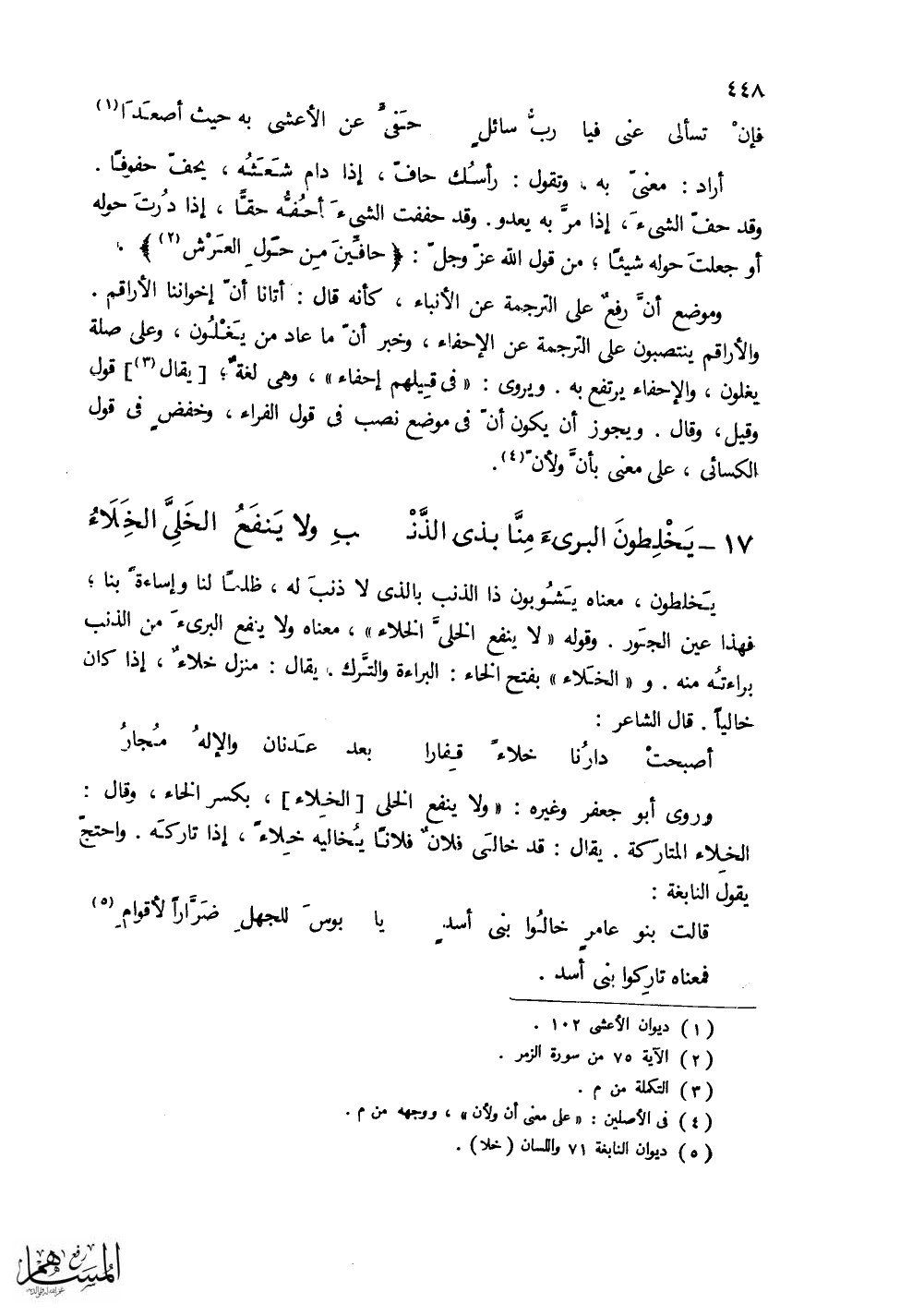(يَخْلِطونَ البريءَ مِنَّا بِذي الذَّنْ ... بِ ولا يَنْفَعُ الخَلَّيِ الخَلاَءُ)