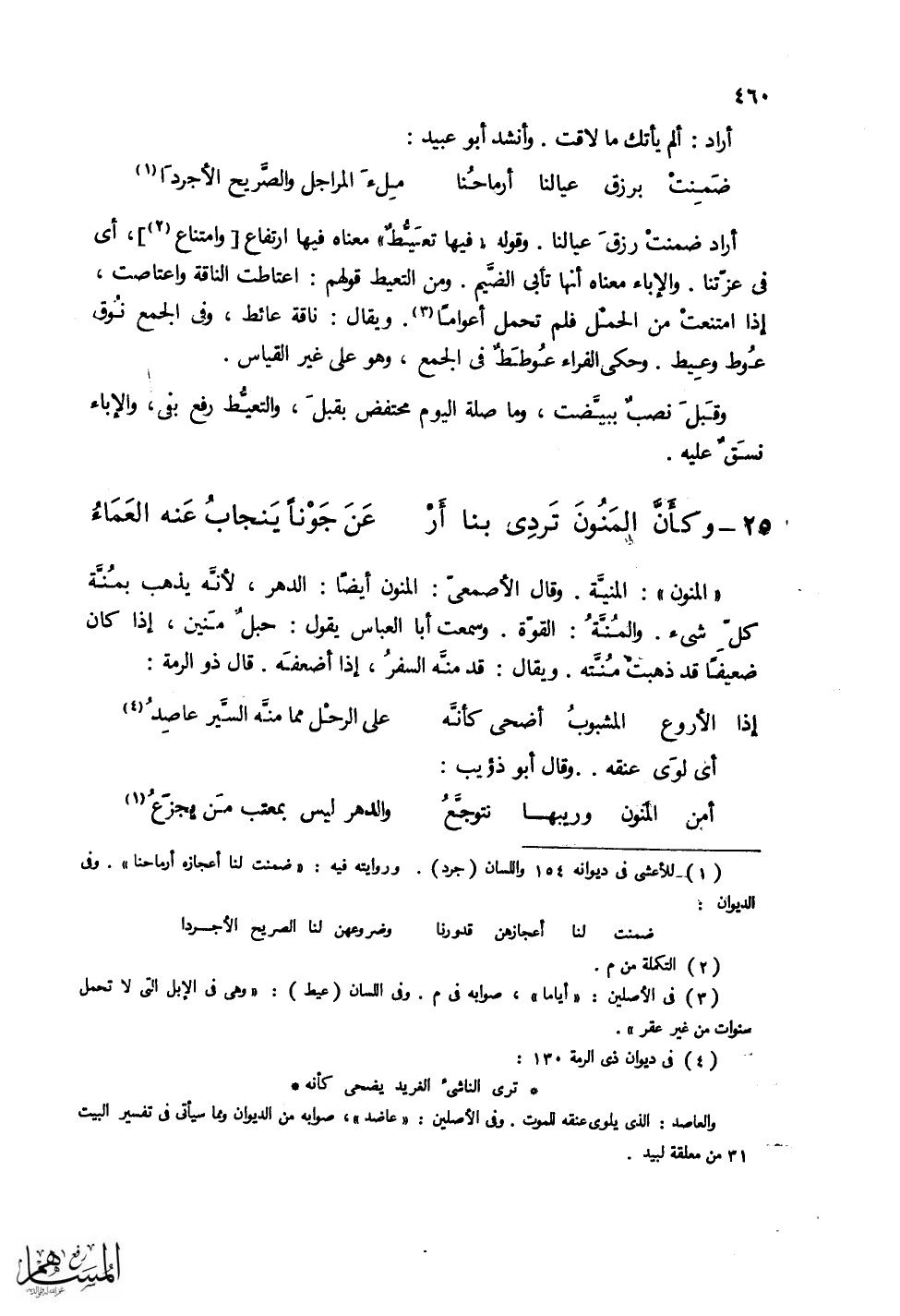 (وكأَنَّ المَنُونَ بنا أَرْ ... عَنَ جَوْناً يَنْجابُ عَنه العَمَاءُ)