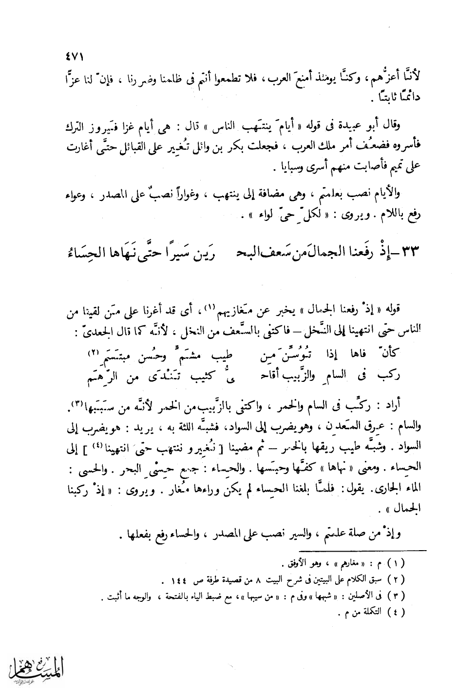 (إِذْ رفَعْنا الجِمالَ من سَعَفِ البَح ... رَينِ سَيراً حتَّى نَهَاها الحِسَاءُ)