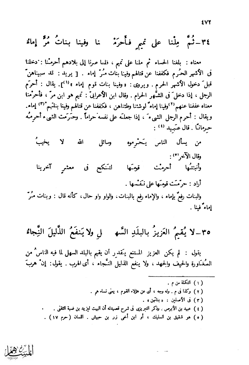 (ثُمَّ مِلْنا عَلى تميمٍ فأَحرَمْ ... نا وفينا بَنَاتُ مُرٍّ إِماءُ)