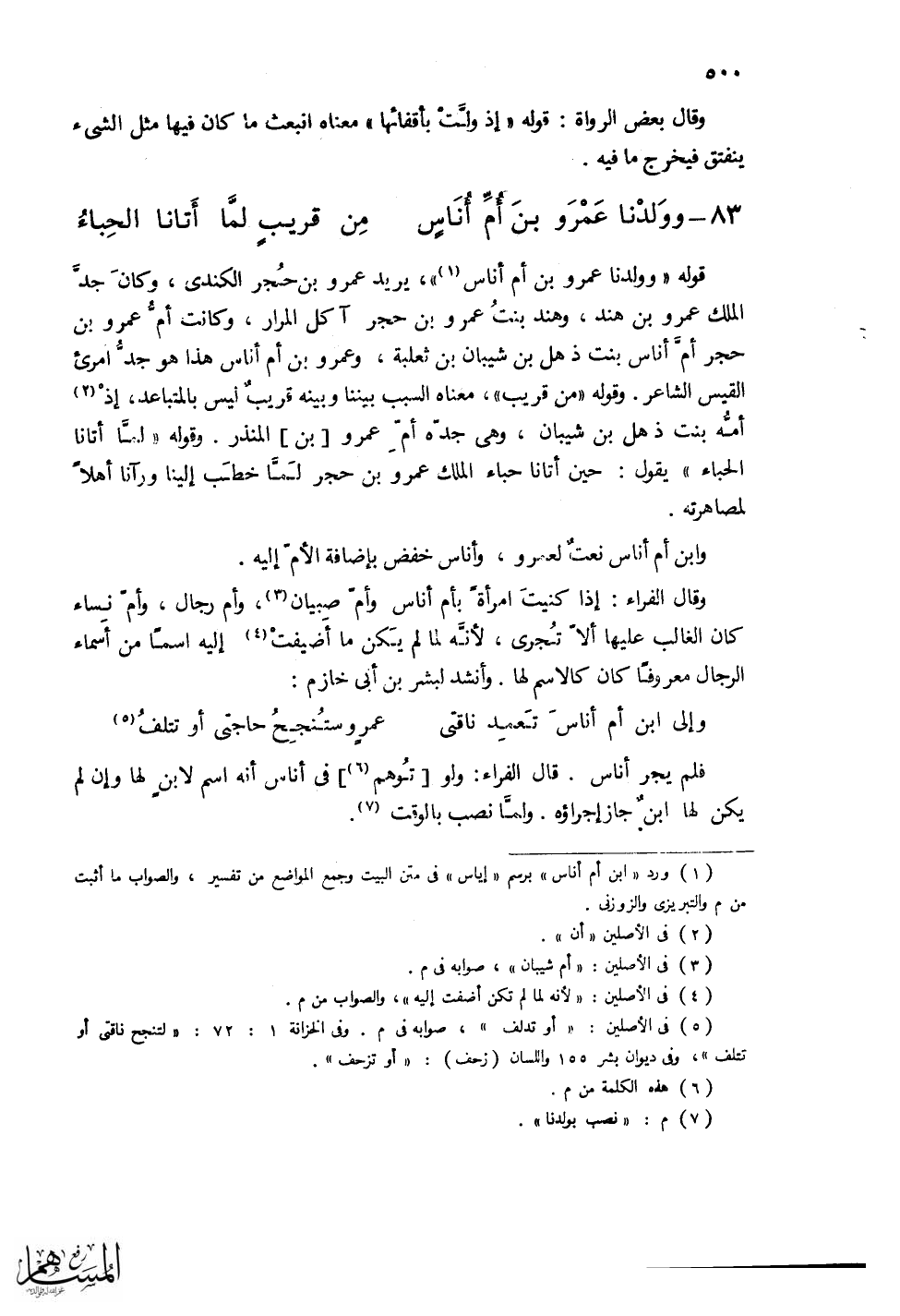 وابن أم أناس نعت لعمرو، وأناس خفض بإضافة الأم إليه.