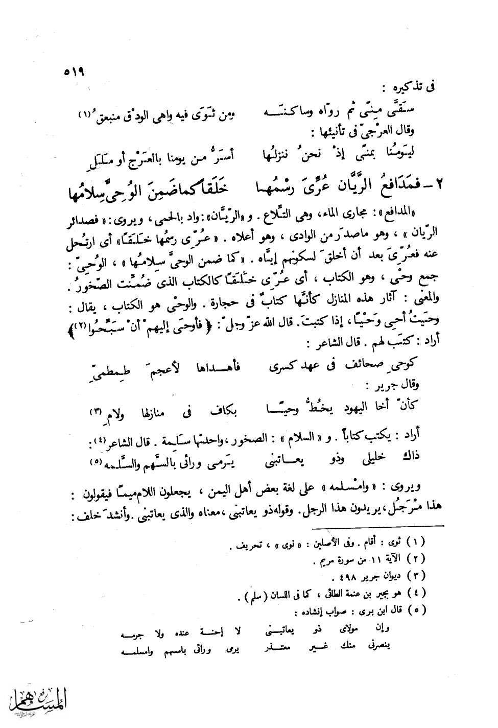 (فمَدَافعُ الرَّيَّانِ عُرِّىَ رسْمُها ... خَلَقاً كما ضَمِنَ الوُحِيَّ سِلامُها)