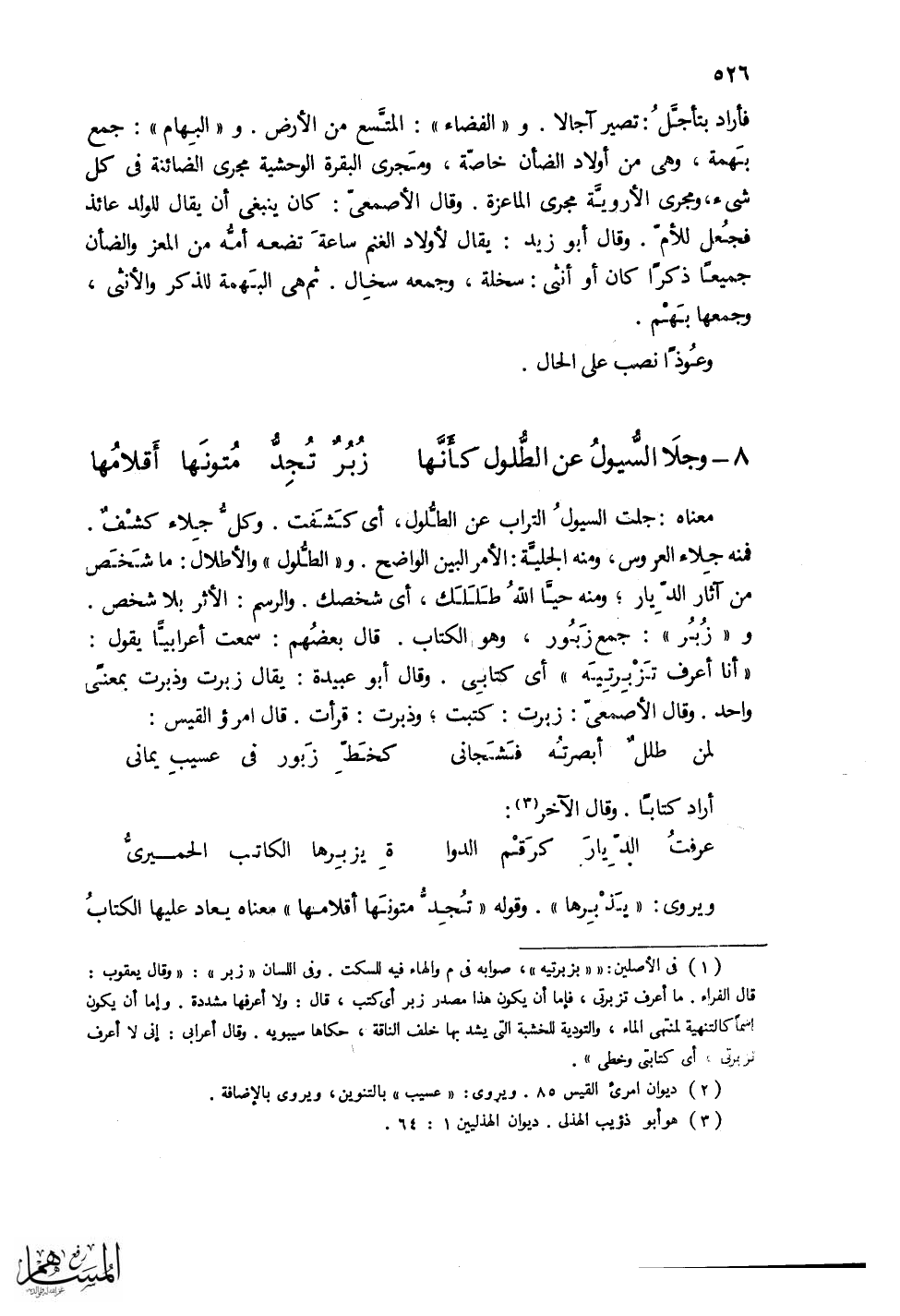 (وجلاَ السُّيولُ عن الطُّلول كأَنَّها ... زُبُرٌ تُجِدُّ مُتونَها أَقلامُها)