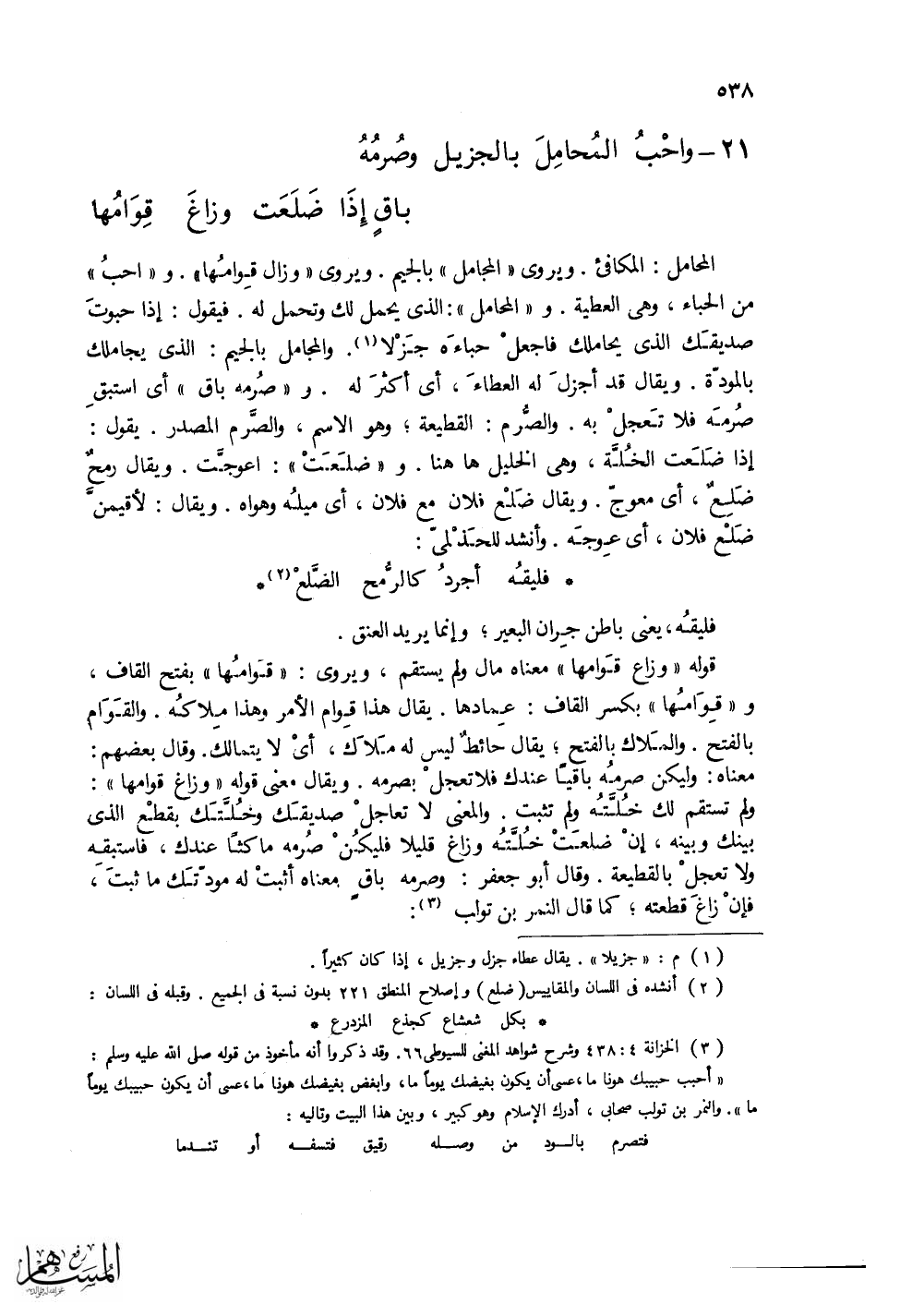 (واحْبُ المُحَامِلَ بالجزيلِ وصُرمُهُ ... باقٍ إذا ضَلَعَتْ وزاغ قِوَامُها)