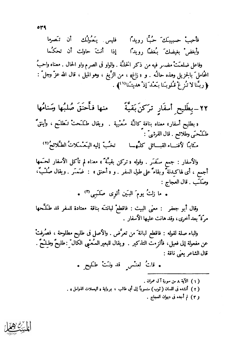 (بطليح أسفار) معناه بناقة كالة معيية. ويقال: طلحت تطلح، وأينق طلحى وطلائح. قال القرشي: