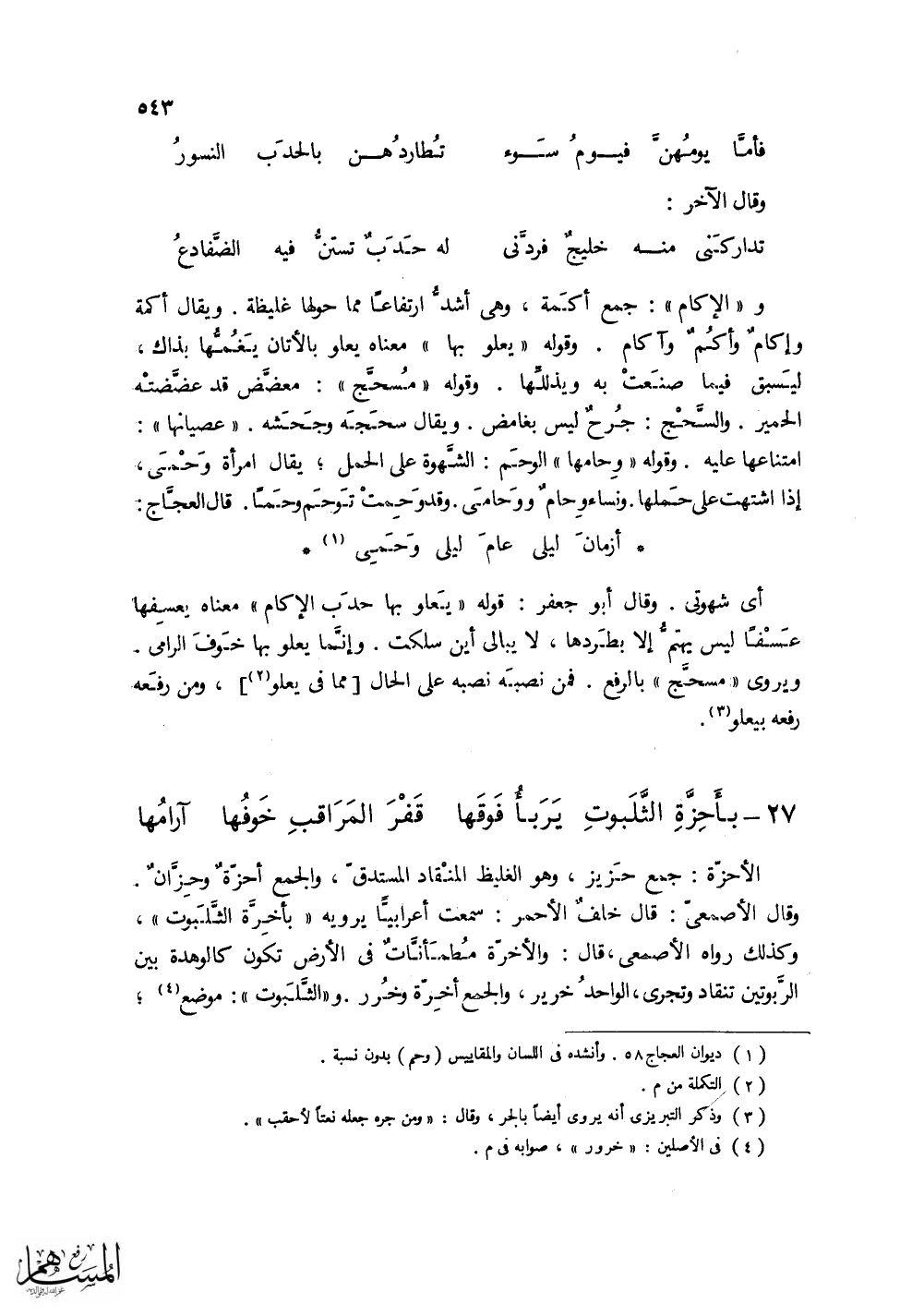 (بأَحِزَّةِ الثَّلَبوتِ يَرَبأُ فَوقَها ... قَفْرَ المَرَاقبِ خَوفُها آرامُها)