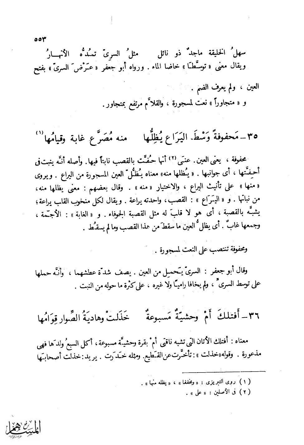 محفوفة، يعني العين. عنى إنها حفت بالقصب نابتا فيها. وأصله إنه ينبت في أحفتها، أي جوانبها.