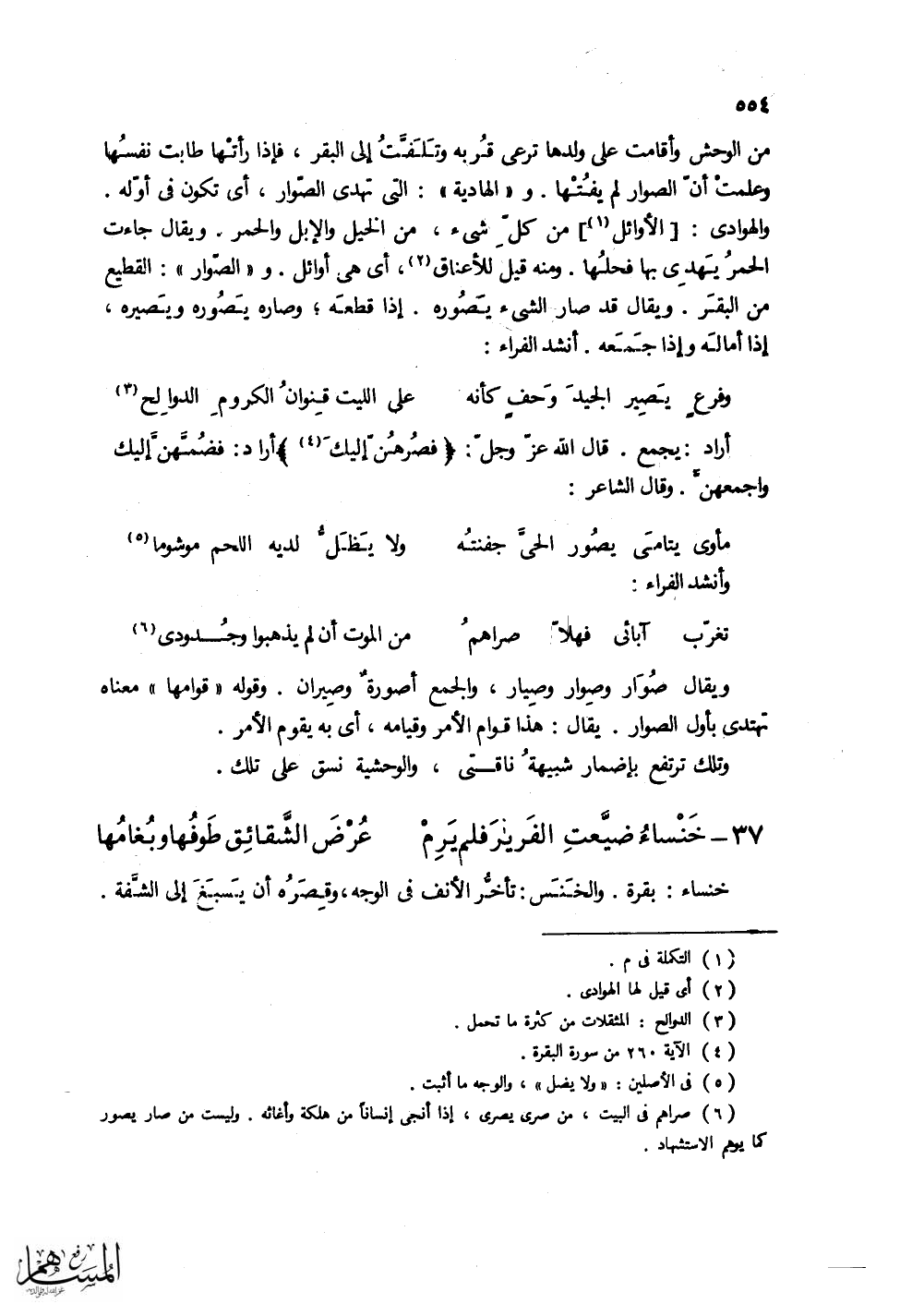 من الوحش وأقامت على ولدها ترعى قربه وتلفت إلى البقر، فإذا رأتها طابت نفسها وعلمت أن الصوار لم يفتها. و (الهادية): التي تهدى الصوار، أي تكون في أوله. والهوادي: الأوائل من كل شيء، من الخيل والإبل والحمر.