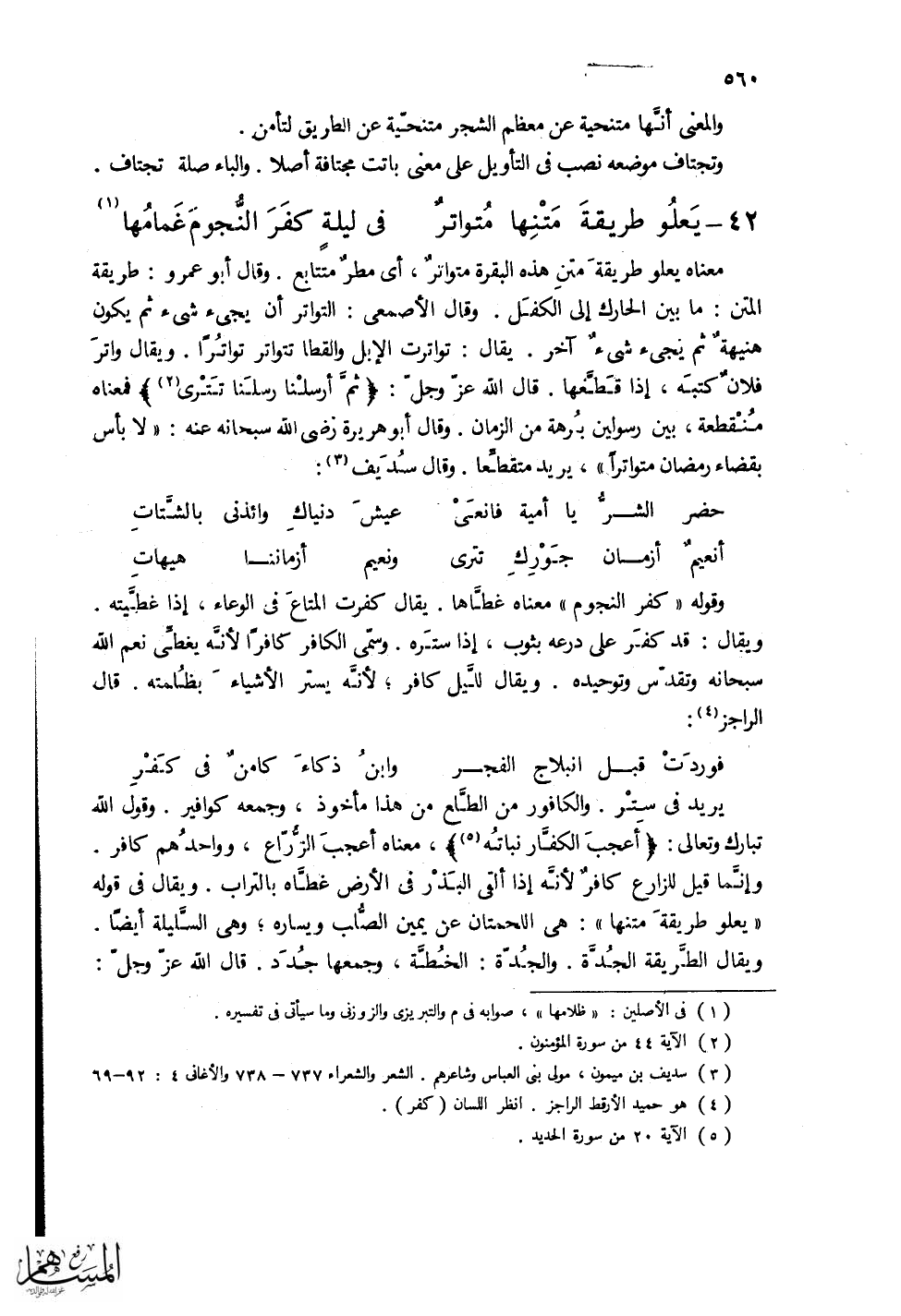(يَعلُو طريقةَ مَتْنها مُتواترٌ ... في ليلةٍ كفَرَ النُّجومَ غَمامُها)