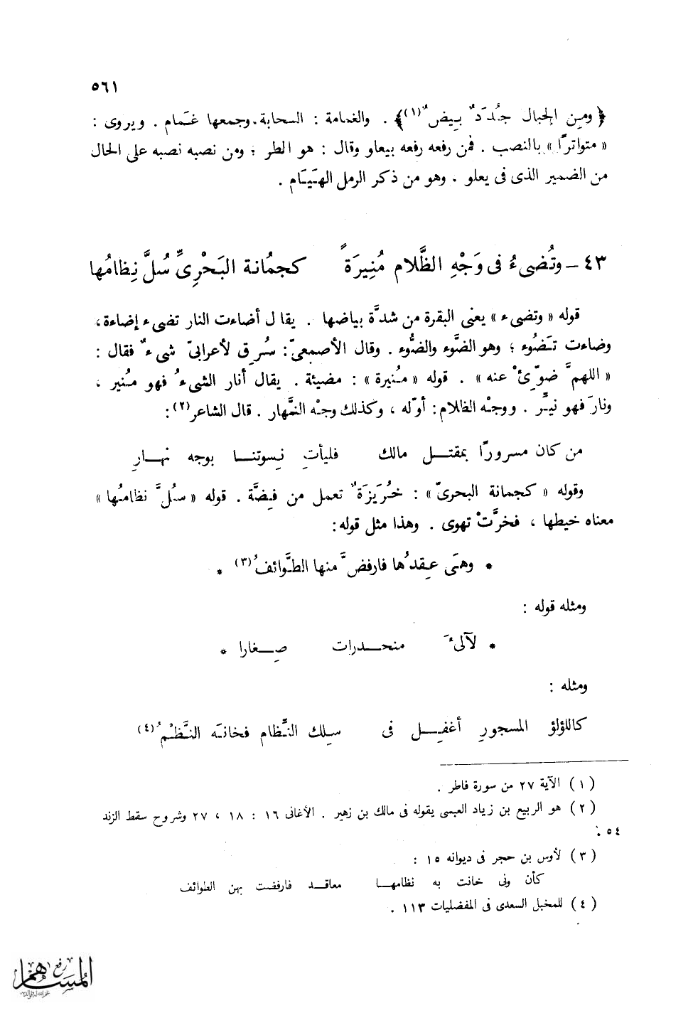 (وتُضيءُ في وَجْهِ الظَّلامِ مُنِيرَةً ... كجُمَانة البَحْرِيِّ سُلَّ نِظامُها)