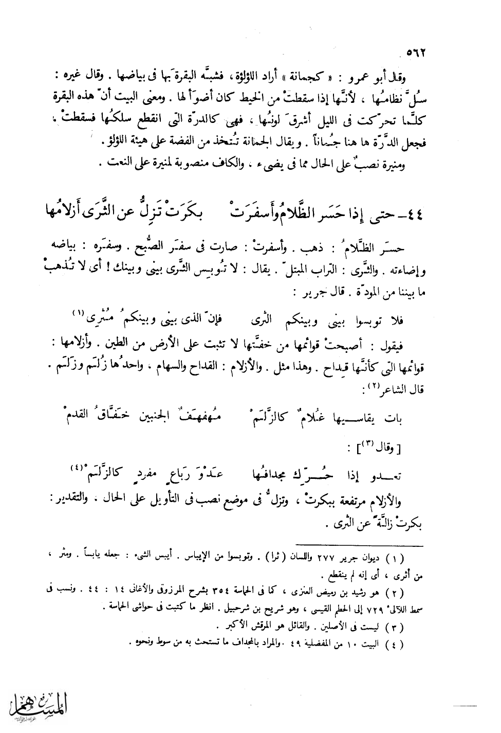 (حتّى إذا حَسَر الظَّلامُ وأَسفَرَتْ ... بكَرَتْ تَزِلُّ عن الثَّرَى أَزلامُها)