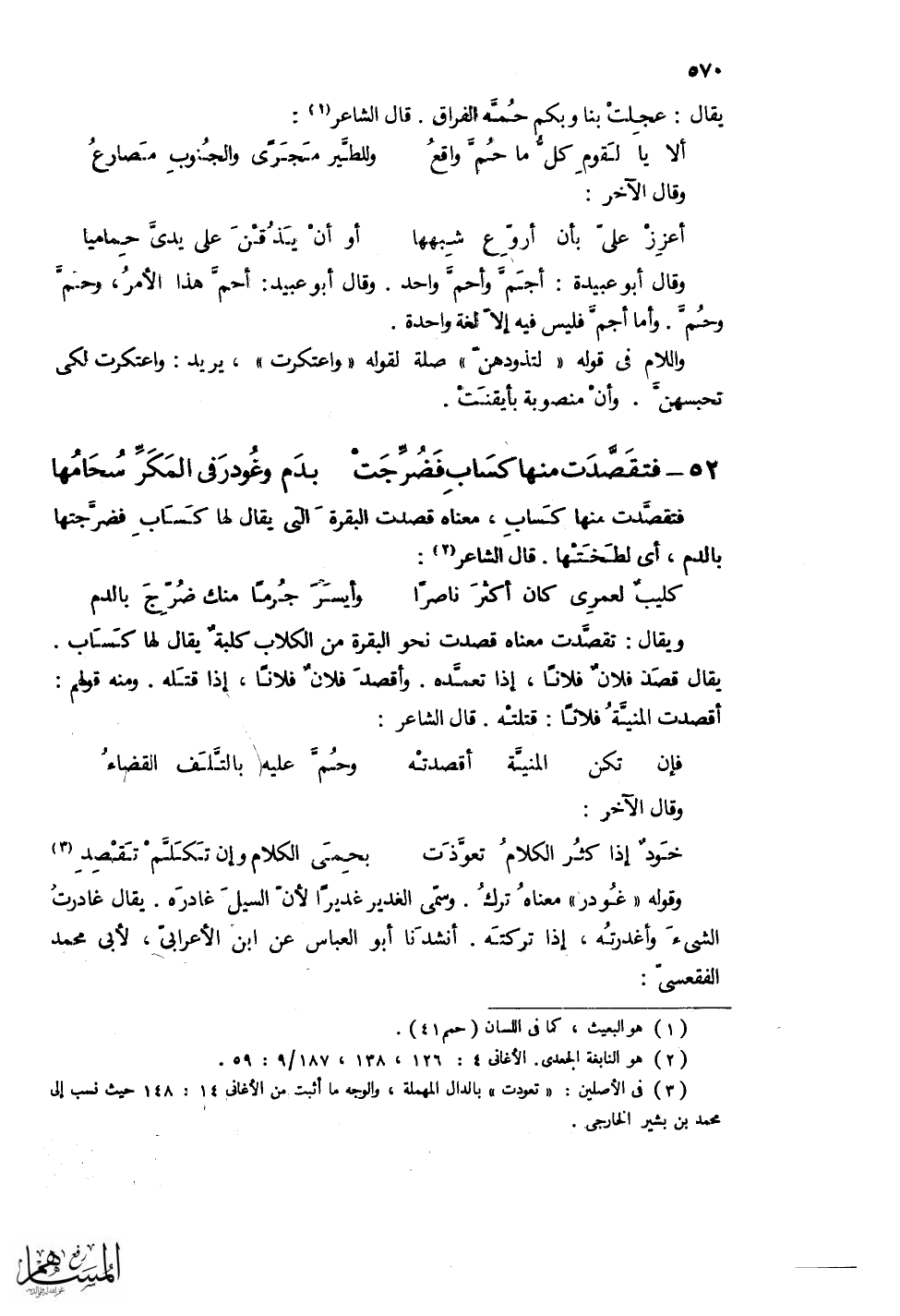 (فتقَصَّدَتْ منها كَسَابِ فَضُرِّجَتْ ... بدَمٍ وغُودرَ في المَكَرِّ سُحَامُها)