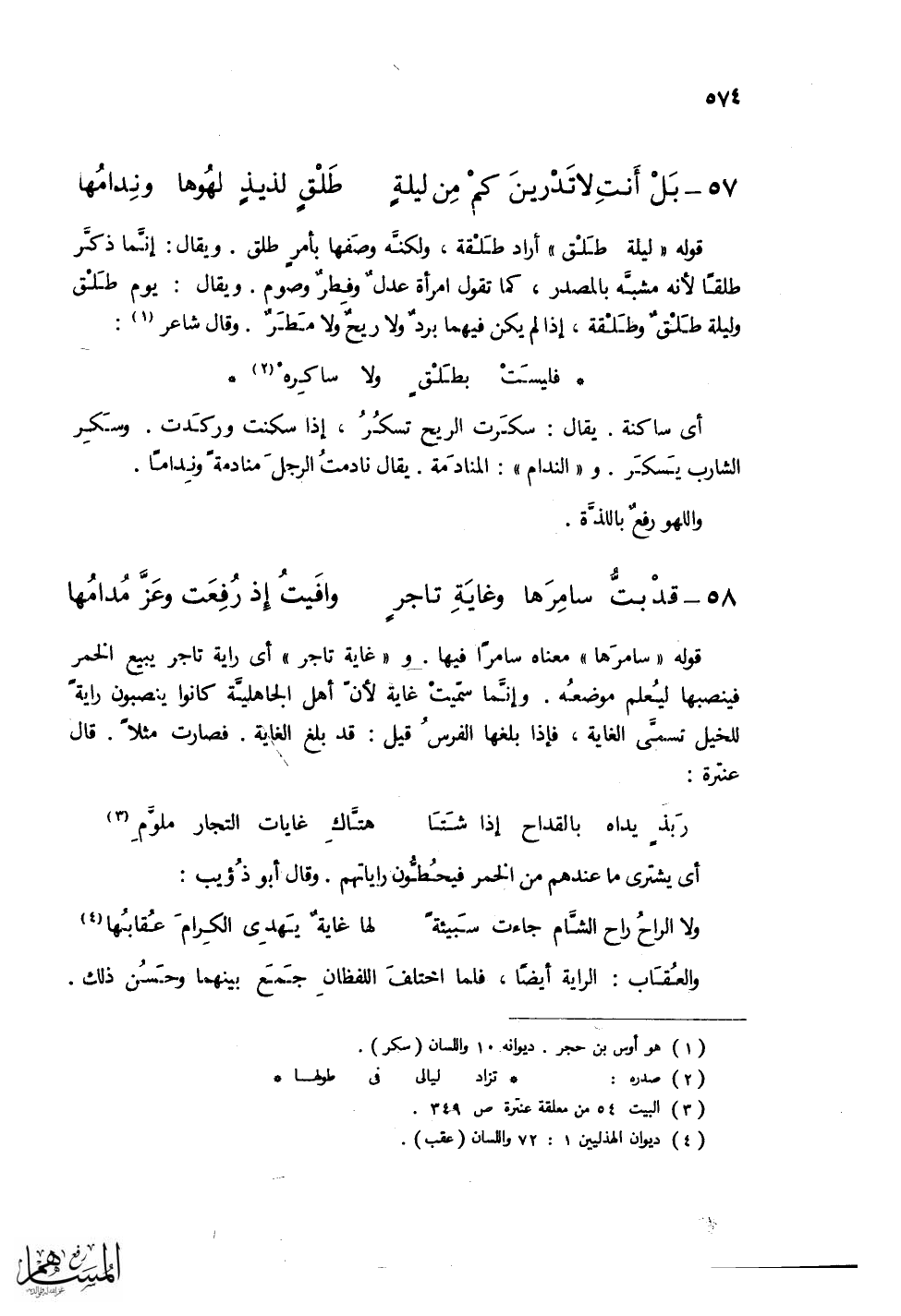 (بَلْ أَنتِ لا تَدْرِينَ كَمْ مِن ليلةٍ ... طَلْقٍ لذيذٍ لهوُها ونِدامُها)
