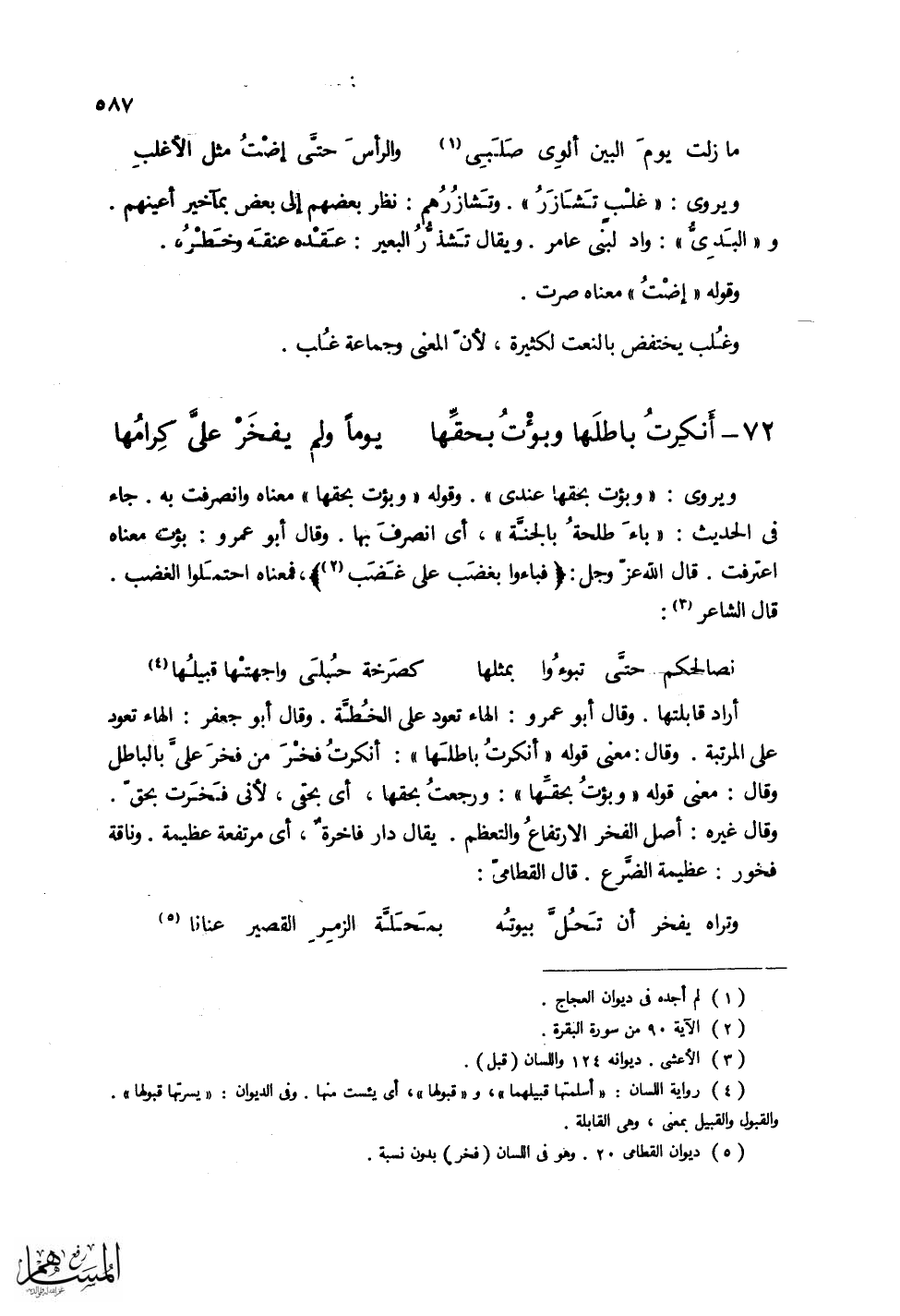 وقال: معنى قوله (أنكرت باطلها): أنكرت فخر من فخر علىَّ بالباطل. وقال: معنى قوله (وبؤت