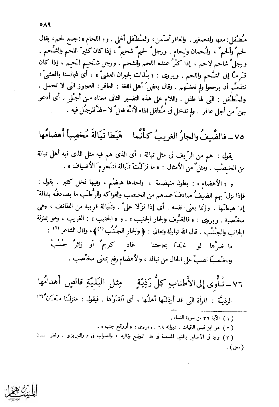 (فالضَّيفُ والجارُ الغريبُ كأَنَّما ... هَبَطا تَبَالةَ مُخْصِباً أَهضامُها)