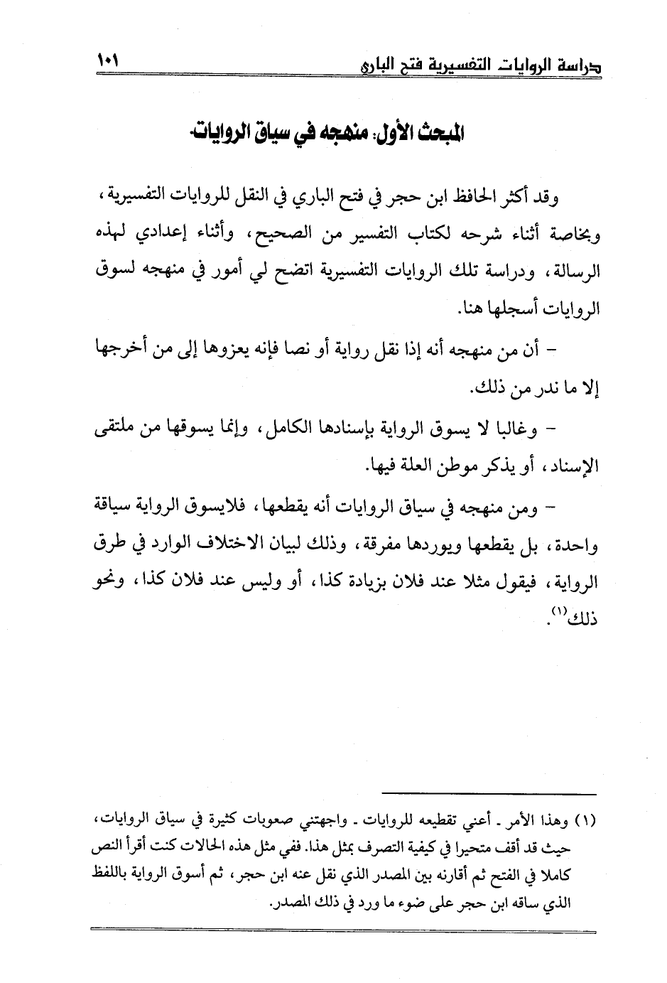 1 وهذا الأمر - أعني تقطيعه للروايات - واجهتني صعوبات كثيرة في سياق الروايات، حيث قد أقف متحيرا في كيفية التصرف بمثل هذا. ففي مثل هذه الحالات كنت أقرأ النص كاملا في الفتح ثم أقارنه بين المصدر الذي نقل عنه ابن حجر، ثم أسوق الرواية باللفظ الذي ساقه ابن حجر على ضوء ما ورد في ذلك المصدر.