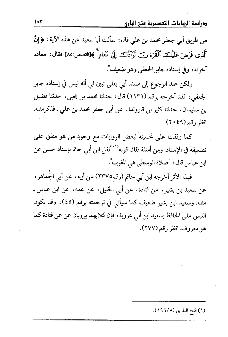 من طريق أبي جعفر محمد بن علي قال: سألت أبا سعيد عن هذه الآية: {إِنَّ الَّذِي فَرَضَ عَلَيْكَ الْقُرْآنَ لَرَادُّكَ إِلَى مَعَادٍ} [القصص: 85] فقال: معاده آخرته، وفي إسناده جابر الجعفي وهو ضعيف".