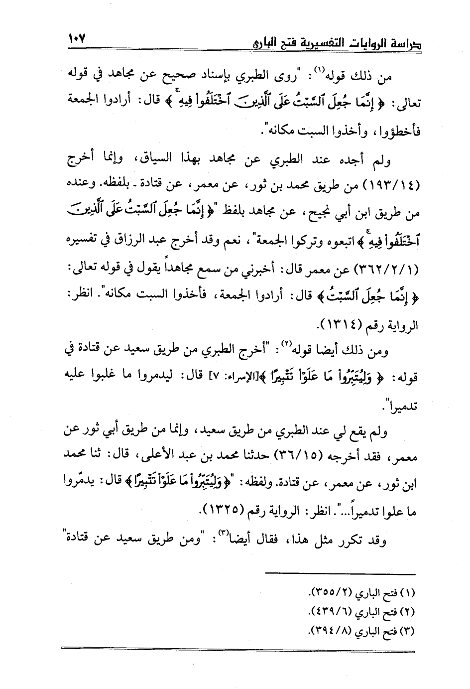 من ذلك قوله1: "روى الطبري بإسناد صحيح عن مجاهد في قوله تعالى: {إِنَّمَا جُعِلَ السَّبْتُ عَلَى الَّذِينَ اخْتَلَفُوا فِيهِ} قال: أرادوا الجمعة فأخطؤوا، وأخذوا السبت مكانه".