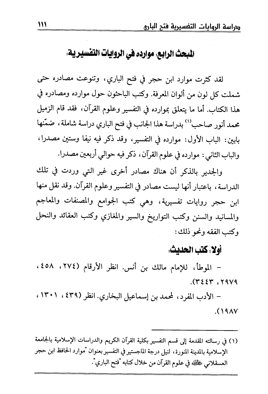 1 في رسالته المقدمة إلى قسم التفسير بكلية القرآن الكريم والدراسات الإسلامية بالجامعة الإسلامية بالمدينة المنورة، لنيل درجة الماجستير في التفسير بعنوان "موارد الحافظ ابن حجر العسقلاني رحمه الله في علوم القرآن من خلال كتابه "فتح الباري".