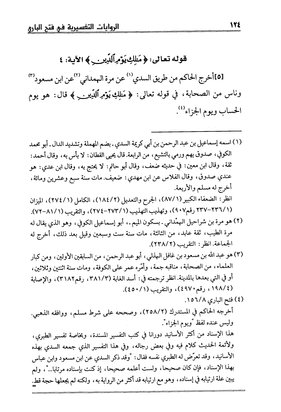 أخرج الحاكم من طريق السدي1 عن مرة الهمداني2 عن ابن مسعود3 وناس من الصحابة، في قوله تعالى: {مَالِكِ يَوْمِ الدِّينِ} قال: هو يوم الحساب ويوم الجزاء4.